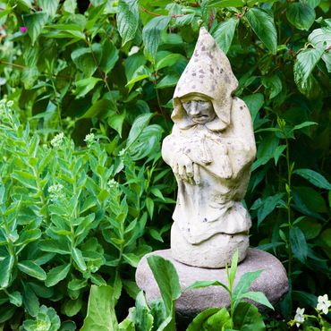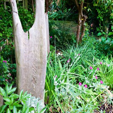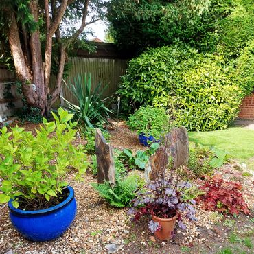 A gravel front garden planted with bulbs and perennials and some Yew topiary. The back is quite shady with a lawn and pond alongside a small rockery. There are shrubs and greenery for a flower arranger, planted mainly with perennials and yuccas, the original taken from my parent’s home in South Devon, which seem to thrive here. A small raised bed for runner beans and flowers for cutting, including a patio and seat at the end of the garden providing a quiet place to enjoy the evening sun. Decking offers a different view of the garden with further seating. Slate taken from a pond makeover presents complimentary shapes to the pieces of drift wood scattered throughout. Hedges surround most of the garden attracting birds.