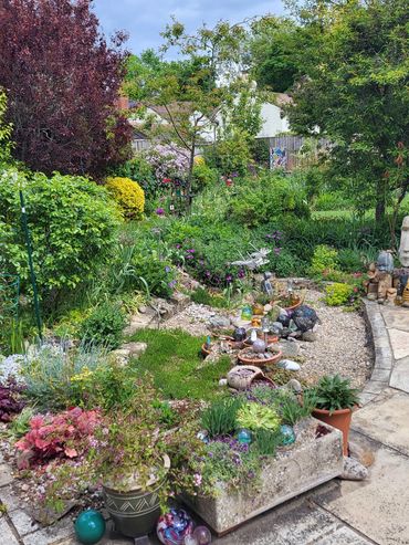A medium sized garden for all seasons. Informal garden with sweeping borders filled with a wide range of plants – salvias, clematis and roses being particular favourites. Pots and sculptural objects provide extra interest. Hand crafted wooden items will be for sale. On display will be a knitted garden and walking sticks. Wheelchair accessible.